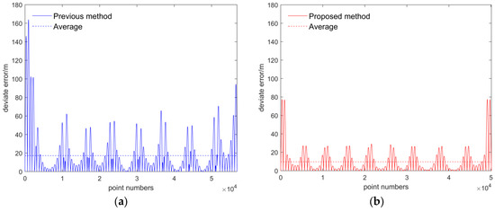 The length of the trajectory generated by the previous method is 7548.9 m, as shown in Figure 11a. The trajectory length resulting from the proposed method is 5627.3 m, as shown in Figure 11b. It can be seen from the figure that the deviation degree of the trajectory generated by the improved method is smaller than that before; a quantitative analysis was carried out, and the results are shown in Figure 12.
