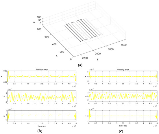 The desired trajectory and the actual trajectory are shown in Figure 13a. Because the desired trajectory and the actual trajectory are not completely identical, Figure 13b,c show the error differences between the desired trajectory and the actual trajectory over time. The maximum error of position is about mm, while the maximum error of velocity is about mm/s. This finally shows that the UAV can effectively track the generated trajectory.