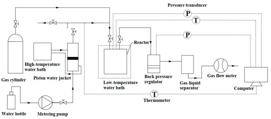 The gas production measurements were carried out in a high-pressure cylinder 50 mm in diameter and 50 mm in length. A PTFE bushing with a diameter of 49 mm, a height of 43.5 mm, and a thickness of 4 mm was used to hold the hydrate-bearing sediments. Two thermal resistances (Beijing West AVIC Co., Ltd., Beijing, China, PT100, 223.15–473.15 K, ±0.1 K) were inserted from the top of the cylinder, which were used to measure the temperature in gas and sediments, respectively. There was a pressure sensor (Beijing West AVIC Co., Ltd., CYB-20, 0–20 MPa, ±1 MPa) at the top of the reactor to monitor the pressure change in the reactor. A stainless steel pipe that was 3 mm in diameter was inserted along the axis of the cylinder, which was used to simulate the production well. The cylinder was equipped with an injection system that comprised a water bottle, an advection pump (Shanghai Wufeng Instrument Co., Ltd., Shanghai, China, LC-P100, 0–21 MPa, 0–9.999 mL/min, accuracy: ±0.001 mL/min), and a piston water jacket, as seen in Figure 1. The cooling jacket was connected to the high-temperature thermostatic bath (Ningbo Tianheng Co., Ltd., Ningbo, China, THGD1020) for heat exchange to maintain the constant temperature of the injected hot water. The water bottle was injected into the bottom of the water jacket through the advection pump, pushing the piston inside the water jacket to move upward, and the hot water was pushed into the reactor. The gas collection system was composed of a back pressure valve (OSK, Beijing, 15–2500 psig, 250.15–373.15 K, accuracy: ±0.001 MPa) and a wet gas flow meter (Changchun Alpha Instrument Co., Ltd., Changchun, China, LMF-1, accuracy: ±1%). The data acquisition unit recorded the pressure and temperature as they varied over time.