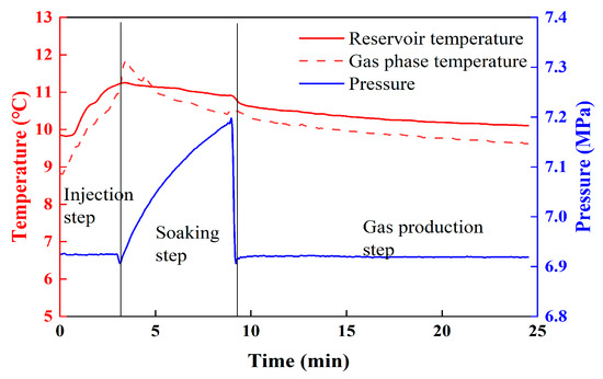 The gas production stage was further divided into 3 steps: thermal injection, soaking, and gas production steps [35,36,37]. In the thermal injection step, the advection pump injected the hot liquid into the cylinder at a rate of 10.0 mL/min for a certain period of time. To safely inject water into the cylinder, the production well was opened and the pressure during injection was kept near 6.9 MPa, which was kept constant by a back pressure regulator. After that, the system was soaked for 6 min and the injected hot liquid was allowed to penetrate around the reservoir, as seen in Figure 2. At last, the valve was opened so that the CH4 released from hydrate dissociation could be vented from the production well. When the instantaneous flow was 0 mL/min, the test was stopped, all valves were closed, and the data were saved. Finally, the pressure was set the back to 0.1 MPa to release the residual gas in the reactor.
