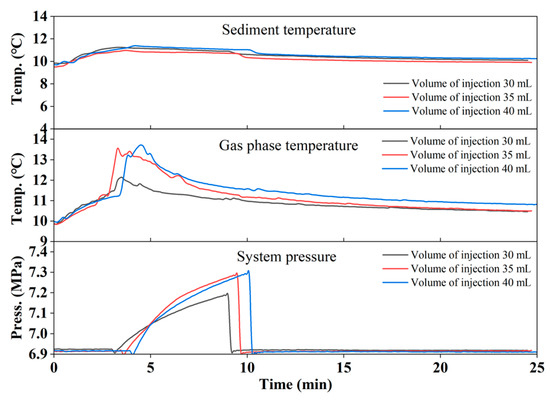 The effects of the amount of injected hot water on gas production were investigated in Exp. 1–3, and the temperature and pressure profiles can be seen in Figure 3. As the injected hot water increased from 30 to 40 mL, the sediment temperature increased quickly in the injection step and kept relatively constant by 1–2 °C above the initial temperature in the soaking step. However, the amount of injected hot water was not found to have an evident influence on sediment temperature, as seen in Figure 3. The influence of water injection on the temperature of the gas phase was found to be evident in the soaking step. The gas phase temperature was found to rise sharply at the beginning of the soaking step as the hot water injection reached 35 and 40 mL. The pressure rise was also observed in the soaking step, as seen in Figure 3. The pressure increased by 0.3–0.45 MPa as the hot water injection increased from 30 to 40 mL, suggesting that increasing the amount of hot water injection was beneficial to enhancing gas production. When the injection volume was increased from 35 mL to 40 mL, we discovered that gas production actually dropped. This is due to the fact that the water volume in the cell increased and the water output in the experiment could not be discharged due to the restriction of the experimental setup, which resulted in a thicker water layer in the reactor at the later stage of injection. The additional 5 mL of water was mostly used to heat the reactor’s free water and decomposition gas. Moreover, the reactor’s empty area after sand loading was 49 mL, meaning that less water could be injected into it (5 mm between the PTFE and the reactor). When the injection volume was 40 mL, the water layer had reached the top of the reactor and the gas production well was surrounded by water, making it more difficult for the gas to penetrate the thick water layer to reach the gas production well, resulting in a lower collected gas production volume.