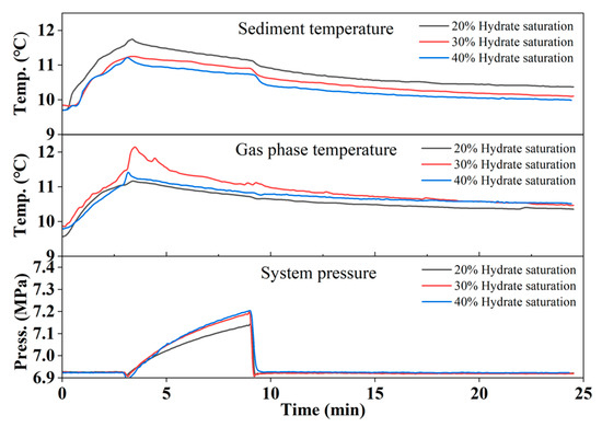 Temperature and pressure changes under different injection temperatures in the sediments at 9 °C and 6.9 MPa with 30% hydrate saturation.