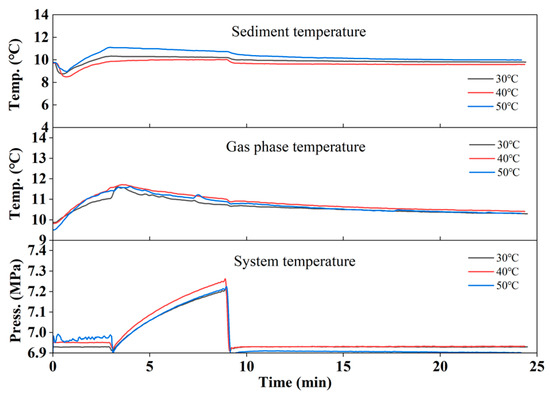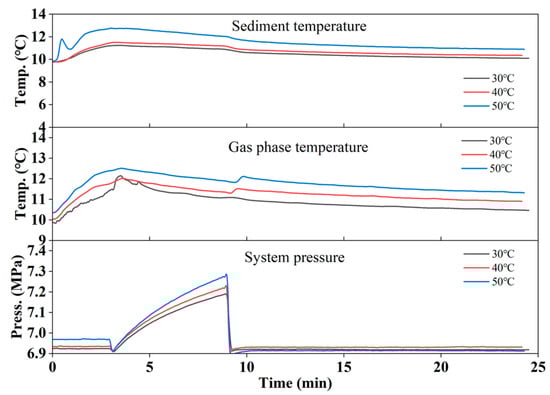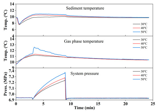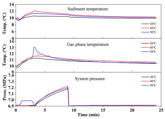 The effect of injected hot water temperature was investigated in Exp. 1, 6, and 7, where the hot water temperatures were 30, 40, and 50 °C, respectively. It could be seen that the temperature rise in sediments increased by 1.3, 1.7, and 2.8 °C, respectively, as seen in Figure 5; these increases were higher than simply increasing the volume of injected water. However, the pressure rise during the soaking step was not found to evidently enhance gas production, suggesting that the injected heat was not adsorbed by hydrates [41]. Although gas production was increased from 0.392 to 0.488 L, the thermal efficiency reduced from 37.3 to 23.6%.