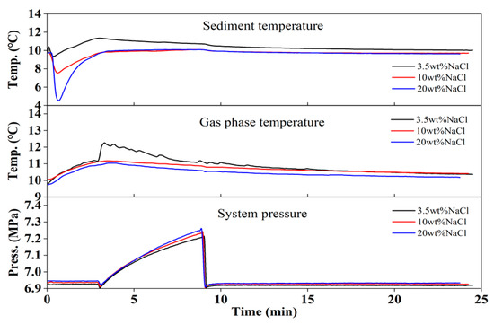 Temperature and pressure changes under different salinity in the sediments at 9 °C and 6.9 MPa with 30% hydrate saturation.