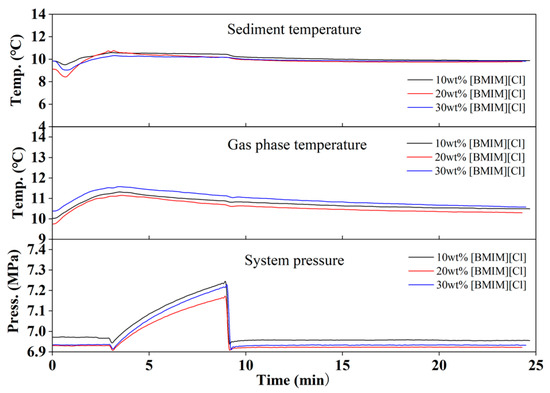 When BMIM-Cl solution was injected, the temperature in the hydrate-bearing sediments dropped quickly, which was quite similar to the profile observed in brine injections. It should be noted that the temperature rise in the gas phase evidently increased, as seen in Figure 8, suggesting that more heat was used to warm the gas phase rather than the sediments. Therefore, the pressure rise during the soaking step was slight and did not surpass 0.35 MPa.