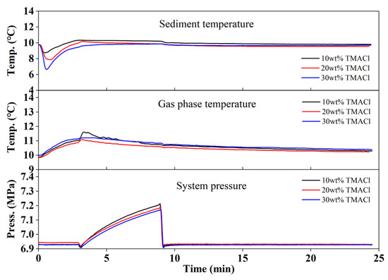 The dissociation behavior of CH4 hydrate in the presence of TMACl was a little different from BMIM-Cl, as seen in Figure 10. The sediment temperature did not rise greatly above the initial sediment temperature after the initial sharp decrease. By increasing the TMACl concentration form 10 to 30 wt%, the initial drop of sediment temperature was large, suggesting that more hydrate was dissociated due to the presence of TMACl. However, the pressure was not found to evidently increase, as it was less than 0.3 MPa. The temperature of the gas phase was also evidently increased after injection and was similar to the temperature increase related to BMIM-Cl injection.