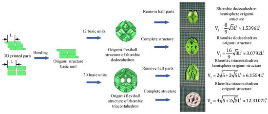 As a further step, four possible origami flexiball variants for bionic jellyfish robots were derived (Figure 1). The two hemispherical origami structures are formed by removing some units from the complete structure of the corresponding origami flexiball. The four origami flexiball structures and their volumes are calculated in Figure 1, where L is the length of the corresponding thin sheet units. The thin sheet units are printed by a 3D printer and are bonded into the whole flexiball using strong glue.