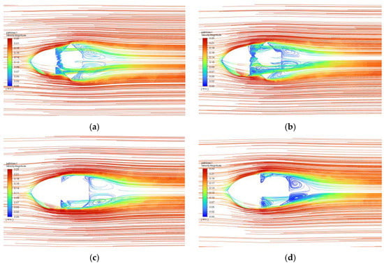 Four bionic jellyfish robots with the given four origami variants and the uniform streamlined shell head were simulated by fluid simulation software at different background flow rates. Figure 2 presents the path lines of the bionic jellyfish robot with the given four origami variants at . Figure 3 compares the differential pressure resistance of the given four origami variants at different swimming speeds. Figure 4 compares the viscous resistance of the given four origami variants at different swimming speeds. Further, Figure 5 displays the contrastive sum of pressure resistance and viscous resistance.