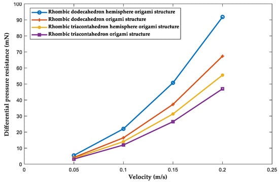 The relationship curve between differential pressure resistance and swimming speed of different origami structures.