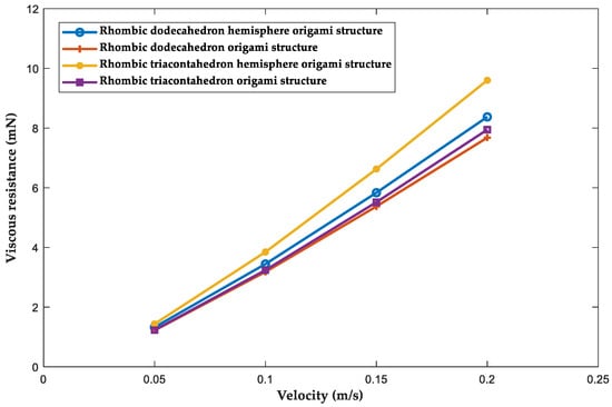 The relationship curve between viscous resistance and swimming speed of different origami structures.