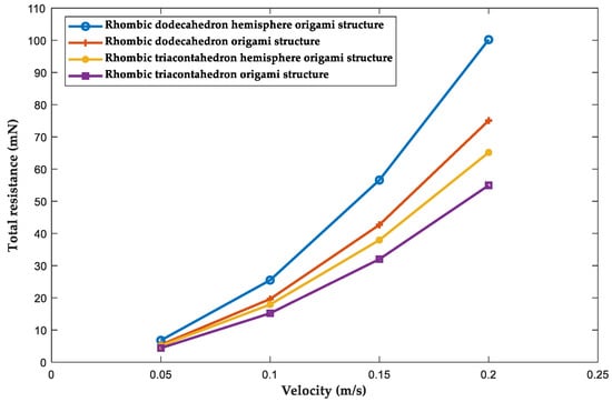 The relationship curve between total resistance and swimming speed of different origami structures.