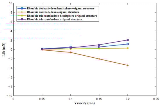 where is the lift coefficient. The change trend between lift and swimming speed of different origami structures is illustrated in Figure 6.