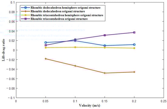 The relationship between the lift–drag ratio and the swimming speed of different origami structures is illustrated in Figure 7.
