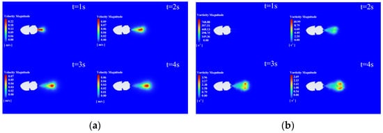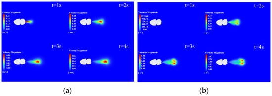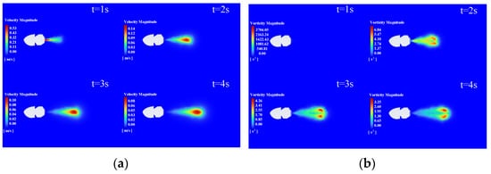 The nozzle injection process is a transient fluid simulation, in which the model is selected as LES (large eddy simulation). The inlet is set as velocity inlet, and the outlet is set as pressure outlet. The nozzle fluid velocity of the bionic jellyfish robot with three different nozzle diameters in the simulation is set to the fluid velocity fitting function in the Table 1. The background velocity is set to 0, similar to fixing the model for simulation, that is, the simulation merely simulates the jetting process of the bionic jellyfish robot. Figure 10, Figure 11 and Figure 12 show the velocity nephograms and vorticity maps in the flow field during the jetting process, respectively.