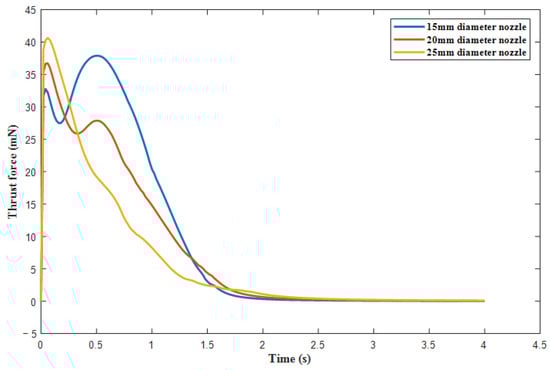 The pressure at the nozzle is integrated to obtain the time-varying curve of the thrust force at different nozzle diameters (Figure 13).