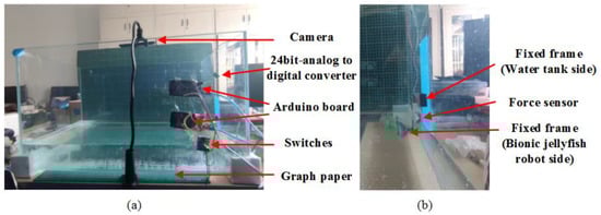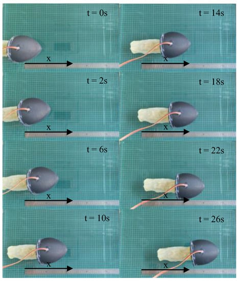 In order to verify the movement results and propulsion performance of the developed bionic jellyfish robot, it was tested on the constructed experimental platform (Figure 20). The obtained videos were processed, and it was concluded that the bionic jellyfish robot completed a total of six action cycles in , advancing a total of , with an average single action cycle advancing , accounting for of the whole body length, and an average speed of .