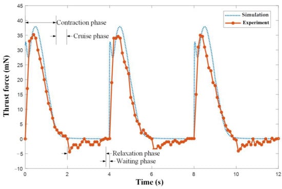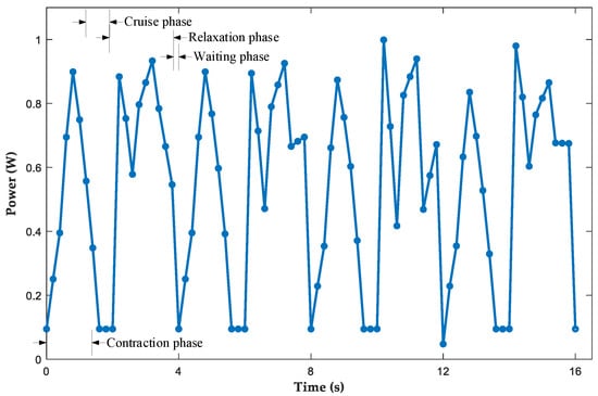 We also tested the power consumption of the origami flexiball-inspired bionic jellyfish robot with a dedicated power measurement module. Due to the poor consistency of the power variation of the origami flexiball-inspired bionic jellyfish robot in the early start-up period, we measured the power variation curve of the origami flexiball-inspired bionic jellyfish robot after three to four cycles of running for four cycles, as shown in Figure 21.