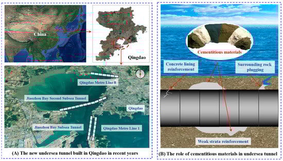 Coastal areas are the most economically developed areas in China, with numerous engineering projects [1] and huge uses of cement-based cementing materials [2]. Currently, cement-based materials are widely used in offshore projects, such as undersea tunnel construction [3], offshore oil and gas engineering [4], submarine pipeline construction [5] and offshore bridge construction [6]. Taking Qingdao, a coastal city in northern China, as an example, with the expansion of the construction scope of urban public transport facilities in recent years, the number of undersea tunnels in this area is increasing (as shown in Figure 1A). Cementing materials are widely used in weak strata reinforcement, concrete lining reinforcement, surrounding rock plugging and other conditions (as shown in Figure 1B). The performance of cementing materials directly affects the stability and durability of supporting structures and surrounding rock strata. The increased construction in the area has increased the risk of accidents such as fire. As the undersea tunnel is a narrow and closed structure located in the underwater environment, fire often causes heavy casualties and huge economic losses. At the same time, due to the poor ventilation of undersea tunnels, fire can cause the ambient temperature to reach more than 1000 °C [7]; high temperatures will affect the structural composition of cement-based cementing material, changing the mechanical properties of the material, causing the tunnel structure to crack and affecting the bearing capacity and service life of the undersea tunnel. This can lead to tunnel collapse, threatening the safety and stability of the project [3,8,9,10].