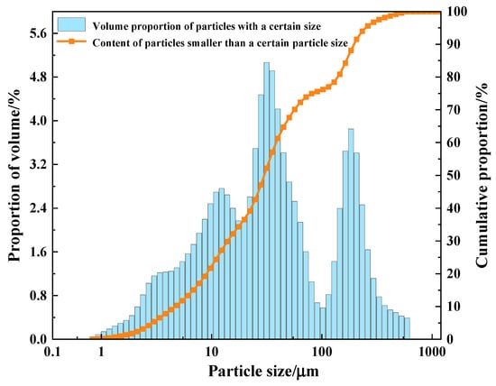 The particle size distribution of cement-based cementitious materials is closely related to their mechanical properties [28]. Particle size analysis of HSFCM was carried out using a Winner 3003 dry laser particle size analyzer, and the particle size distribution curve is obtained as shown in Figure 2. It can be seen that the particle size distribution of HSFCM is uneven, most of the particle size is concentrated in the range of 10~40 μm, particles at the size of about 100 μm are few and the material is poorly graded.