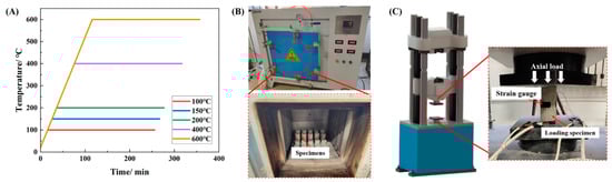 The GR.AF80/14 atmosphere furnace was used for high temperature treatment of the specimens, and the heating temperature was set to 100 °C, 150 °C, 200 °C, 400 °C and 600 °C for five test groups. The specimens at room temperature (20 °C) were used as the control group. In order to ensure that the specimens were uniformly heated, the heating rate was set to 5 °C/min, and the rated temperature was maintained for 4 h (Figure 3A). Then the heating was stopped and the specimens were taken out after natural cooling in the chamber (Figure 3B).