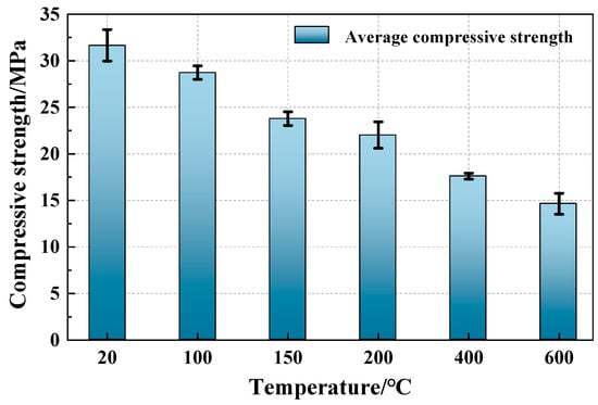 Compressive strength, which is closely related to elastic modulus, peak strain and other mechanical parameters, is the most conventional and important index for testing mechanical properties of materials [30]. A uniaxial compression test was conducted on HSFCM specimens treated by atmosphere furnace. Figure 4 shows the compressive strength of HSFCM treated at different temperatures.