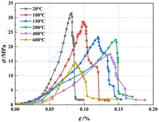 After high temperature treatment, the compressive stress–strain curve of HSFCM can be divided into four stages: compression and compact section, elastic growth section, yield section and residual section. At the initial stage of compression, the specimen stiffness increases due to the external force compaction of the internal pores, and the curve presents an upward concave shape. When the strain reaches 20% of the peak strain of the specimen, the approximate linear growth of the curve indicates that the elastic growth stage is entered. As the loading continues, the curve no longer increases linearly; at this time, the internal damage of the specimen intensifies, and the curve becomes concave downward into the yield section until the specimen’s brittle failure occurs at the peak, and the curve drops sharply. After that, the compressive stress does not increase and the strain increases, entering the residual section. With the increase of temperature, the peak stress and curve slope decrease, and the growth segment before reaching the peak stress decreases. It is particularly noted that after the specimens were treated at 400~600 °C, the color gradually deepened, the mesh cracks appeared on the surface and gradually expanded and some specimens burst, indicating that the HSFCM specimen had local damage between 400~600 °C. This is also the reason for the change of the peak strain trend of the specimen at 400~600 °C. Due to the already existing failure in the specimen after the high temperature treatment, when a small strain occurs in compression of the specimen, it will be reflected as compression failure. Therefore, at 400~600 °C, the stress–strain curve does not reflect the whole process of specimen failure, but only the process of compression failure.