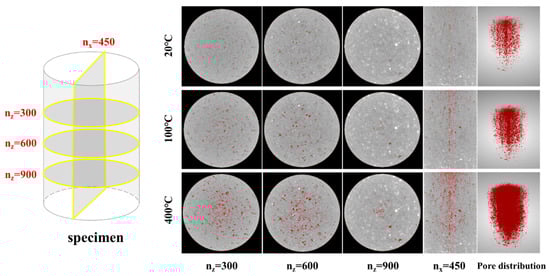 Figure 6 shows CT scanning images of different cross sections (nz = 300 layers, 600 layers, 900 layers), longitudinal sections (nx = 450 layers) and three-dimensional pore distribution of the specimen treated at 20 °C, 100 °C and 400 °C. The images were rendered—the higher the density, the whiter and brighter the image color—and a threshold segmentation method was used to obtain the distribution of pores within the specimen, marked in red.