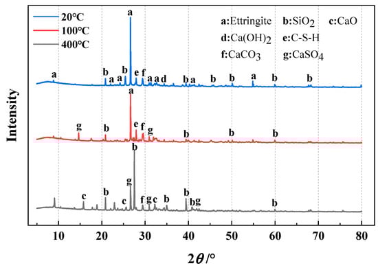 High temperature deterioration of cement-based cementitious materials is not only a physical process, but also a chemical reaction of composition change [34,35,36]. Therefore, an X-ray diffraction test (XRD) was used to discuss the composition change under the condition of thermal decomposition of materials, and the XRD pattern as shown in Figure 7 was obtained.