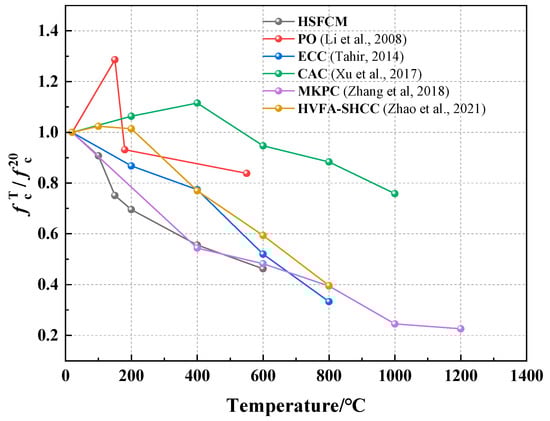 The ratio of compressive strength of HSFCM after high temperature treatment to compressive strength at room temperature was selected and compared with silicate cement PO [37], engineering cementitious composites ECC [17], calcium aluminate cement CAC [38], magnesium potassium phosphate cement MKPC [39] and strain-hardening cementitious composites with high-volume of fly ash HVFA-SHCC [20] for comparison (Figure 9).