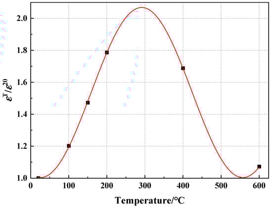 Peak strain is an important index reflecting the deformation capacity, which can be used to analyze the deformation law of cement-based cementitious materials [41,42]. The peak strain of HSFCM treated at each temperature is selected from the stress–strain curve, and the ratio of peak strain treated at high temperature to peak strain at room temperature varies with temperature (Figure 10).
