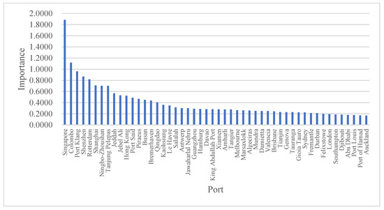 The objective function and constraint condition of Formulas (15) and (16) are then constructed. The real coding-based accelerated genetic algorithm (RAGA) is used to solve the optimization problem. The values of the best projection vector are 0.5889, 0.3871, 0.4251, 0.0145, 0.3273, 0.2929, which is the weight of the corresponding index. In the calculation results, Singapore port, Colombo port, and Port Klang are the most important, with values of 1.8843, 1.1160, and 0.9631, respectively. This is mainly because they are the hub ports of the main line of the MSR and occupy very important core positions in the network. Ilyichevsk port and General Santos port are the least important because of their small hinterland location and poor hub function. Due to space limitation, Figure 4 shows only the ports with the top 50 importance values.
