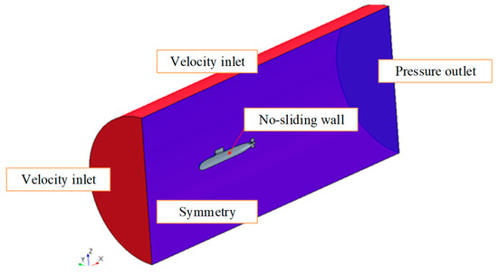 The calculation domain of the flow field is shown in Figure 2. The velocity inlet is 1 LOA (length over all) from the bow, the pressure outlet is 2.5 LOA from the stern, and the radius of the cylindrical boundary domain is 1 LOA. The velocity inlet and the pressure outlet are set as the boundary conditions. The velocity inlet is used at the far field to eliminate the influence of the boundary. A semi-computational domain of flow field and a symmetry boundary condition are used for calculations to reduce the grid size and improve the calculation efficiency. The inlet and the outlet of the computational domain are respectively set as the velocity inlet and pressure outlet. The incoming flow velocity is given as 3.05 m/s, and the circumferential boundary is set for symmetry. The semi-domain cannot be used in the calculations of the integrated submarine hull and propeller, but the full cylindrical computational flow field is employed. The sliding grid technique is used for the model of propeller rotation. The rotational speed of the propeller is 515 rpm. The SIMPLEC method is used for the pressure and velocity iterative coupling computations, in which the convection term is discretized using the second-order upwind scheme, and the dissipation term is discretized using the second-order central difference scheme.