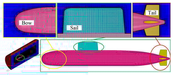 In CFD calculations, mesh discretization usually takes a lot of time and efforts. A reasonable mesh layout can improve both the convergence efficiency and the calculation accuracy. In this paper, STAR-CCM+ is used as the mesh generation tool, and the surface mesh of the hull and appendage models are reconstructed. By controlling the mesh size through basic dimensions and relative dimensions, high-quality surface meshes are generated. On this basis, unstructured meshes are generated by selecting boundary layer and cut volume mesh generators [34,35]. The reasonable distribution of the boundary layer mesh is related to the accuracy of the numerical calculation results. Volume refinements (size = 4%D and size = 2%D) are implemented in the hull surface and tails, respectively. The blade surfaces are refined along the feature lines of the leading and trailing edges (size = 1%D). The mesh size at the boundary layer can be controlled by the dimensionless quantity Y+, which is the nondimensional distance from the hull surface to the first layer of the mesh. For models with a scale similar to the hull model, it is generally considered that Y+ values between 30 and 300 are acceptable [36]. Based on the speed range studied in this paper, the Y+ value range is maintained within this range (30–150), avoiding the transition region from the laminar to the turbulent flow, corresponding to a thickness of 0.8–1 mm for the first layer on the hull surface. To better capture the wake flow details, it is necessary to appropriately densify the tail of the submarine, especially the appendages and their surrounding areas, as shown in Figure 3.
