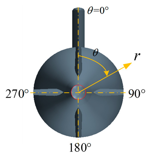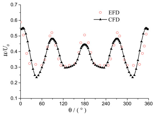 In order to verify the accuracy of the flow field calculation, the following definitions are made. U0 is the incoming flow speed, u indicates the axial velocity of the flow field, u/U0 is the dimensionless axial wake velocity, θ = 0° is the position at the top of the midline of the longitudinal section, and θ = 180° is the position at the bottom of the section, as shown in Figure 5.