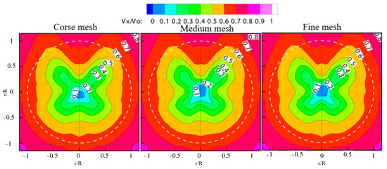 The submarine’s propeller plane is located at a distance of L/3 from the stern, where L is the length of the submarine. To extract information about the wake field at the propeller plane, different grid densities were used to calculate the contour lines of the wake field at the propeller plane, as shown in Figure 6. The contour lines obtained by different meshes are generally consistent. The closer to the surface of the hull, the smaller the velocity potential. When the radius on the propeller plane is less than 0.4R, the flow velocity at the four positions directly behind the cruciform tail fins is significantly accelerated, and when the radius is greater than 0.7R, the flow velocity at the four positions directly behind the cruciform tail fins becomes slower, especially at the circumferential angle of 180 degrees, the minimum; this is due to the obstruction effect of the stern of the cockpit. Figure 7 shows the calculation results of the axial wake fraction at the 0.45R radius of the plane compared to the experimental value. From Figure 7, the flow velocity at the four positions directly behind the cruciform tail fins is the fastest, with the highest at the position of 180 degrees; this is because the front cockpit causes the incoming flow velocity to increase slightly.