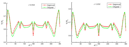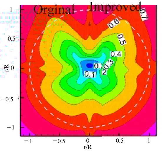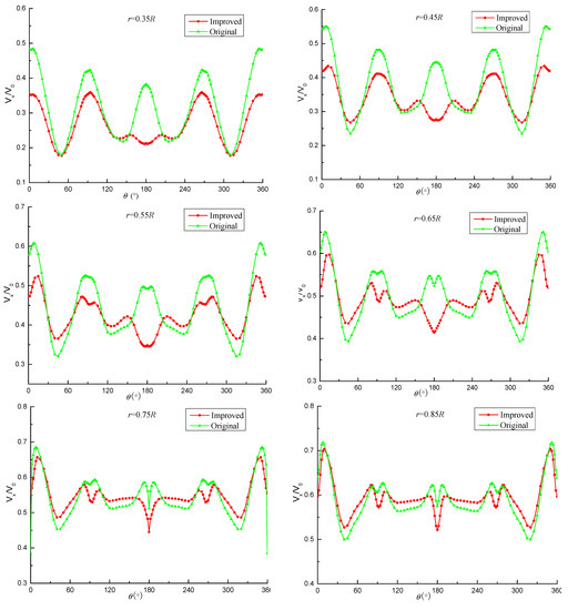 Figure 10 shows the axial velocity distribution at different radii for the two plans. It is found that at the inner radius (r/R < 0.65R), in the rear of the flap; that is, at the 0°, 90°, 180°, and 270° positions, the peak velocity of the improved plan is smaller than that of the original plan at all places. However, in the rear of 180°, there is a phase-opposite situation; that is, the original plan has a speed wave peak at this location, while the improved plan has a relatively small speed valley. It is analyzed that the velocity distribution at this location is less affected by the horseshoe vortex compared to other angles, while, at other positions, in addition to the horseshoe vortex of the flap, there is also nonuniform inflow from the console, and the vortex-canceling effect of the flap only reduces the speed peak. From a 0.75R radius, the axial velocity distribution of the improved plan is basically consistent with that of the original plan, and the amplitude of the improved plan is slightly smaller than that of the original plan. This further indicates that the flap mainly affects the velocity distribution at the inner radius, which is consistent with the previous analysis conclusion.