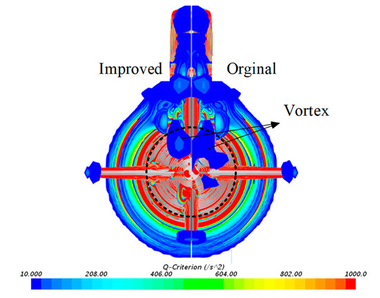 - The analysis of the harmonic components shows that the fillets can effectively reduce the axial velocity pulsation from 0.15 to 0.5, and the wake field of the improved model is more uniform.