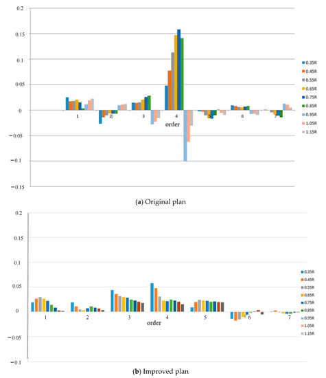 The frequency spectrum is used to express the wake distribution on each radius, which can quantitatively represent the uniformity of the wake field. The wake field is expressed as Formula (8) in the cylindrical coordinate system. Figure 11 shows the harmonics analysis of the axial wake field. The X-axis is the order, and the Y-axis is the amplitude. It is indicated that the amplitudes of low order are larger than those of high order. According to the literature [38], the fluctuation peak values of propeller thrust, torque, and tangential force are associated with the (kZ) harmony component of the wake, while the horizontal force, vertical force, horizontal bending moment, and vertical bending moment of propeller depend on the (Kz + 1) and (kZ − 1) harmonics of the wake, wherein the k = 1, 2, 3… and Z is the blade number, Z = 5 in this paper. It is shown that the wake fields of the improved plan are more uniform than that of the original one, which will cause that the propeller unsteady bearing forces of the improved plan will be lower than those of the original one.