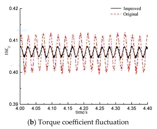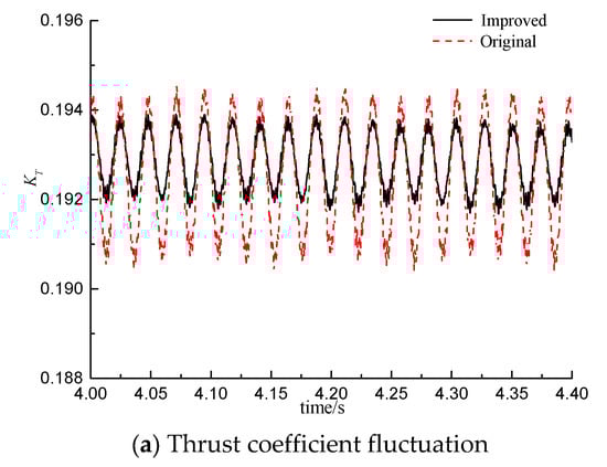 The mean values of the torque and the peak data of BPF~3BPF in the frequency–domain of the propeller’s torque are listed in Table 6. It can be found that, although the mean value of the lateral bending moment is much smaller than the torque, its pulsation value is much greater than the torque, among which, the pulsation value of the bending moment around the Z-axis is the largest, and the bending moment around the Y-axis is the second. Comparing the original plan and the improved plan, it can be known that the mean values of the torque and bending moment coefficients of the improved plan are greater than those of the original plan, indicating that the propeller in the improved plan bears heavier loads; from the perspective of pulsation values, the torque coefficients and the bending moment coefficients around the Z-axis in the improved plan are both smaller than those in the original plan, while the bending moment coefficients around the Y-axis in the improved plan are not much different; overall, the torque pulsation value of the improved plan propeller is smaller.