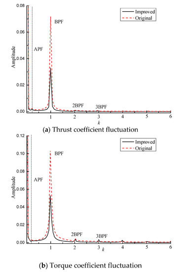 The time–domain and frequency–domain curves of the axial bearing force and torque of the propeller are, respectively, plotted in Figure 12. From the time–domain plot, the axial bearing force and torque of the propeller change periodically with time, and the two plans have the same pulsation frequency. Figure 13 is the frequency–domain value after FFT transformation. From the frequency–domain plot, the axial bearing force and torque of the propeller show different degrees of peaks at the integer multiples of the leaf frequency BPF, with the leaf frequency peak being the largest and then rapidly decreasing. After 4BPF, it can be ignored. From the pulsation value, the frequency–domain pulsation value of the improved plan is significantly smaller than that of the original plan, especially as the pulsation peak value of BPF is about the same as that of the original plan; that is, the improved plan is conducive to reducing the pulsation of the axial bearing force of the tail propeller.