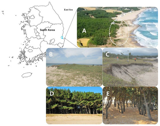 Sampling site and plant ecology description. (A) Hwajin Beach ecotone area. Expanded aerial photographs of the region could not be acquired or presented as the region is a military base. (B) Side view of dune from the north. (C) Side view of the dune from the south. (D) Border between herbaceous plants and Pinus thunbergii colony. (E) Interior of dune canopy showing P. thunbergii dominance.