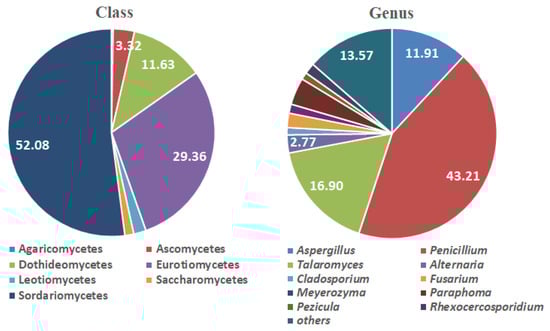 The root-colonizing endophytic fungi in the dune vegetation were dominated by species in the class Sordariomycetes (52.09%). Other frequently encountered classes were Eurotiomycetes (29.36%) and Dothideomycetes (11.63%) (Figure 2). Order Hypocreales was the most frequently encountered (49.03%), followed by Eurotiales (31.30%) and Pleosporales (8.86%). The Family Nectriaceae (46.26%) predominated, and Trichocomaceae (29.09%) and Phaeosphaeriaceae (4.16%) were also represented. Penicillium and Talaromyces accounted for 43.21% and 16.90% of all fungal species, respectively. Aspergillus (11.91%) was also frequently observed. Other genera contributed to ≤3–4% of all fungal species (Figure 2). Aspergillus, Penicillium, and Talaromyces distribute marine terrains or solubilize rock in them [37,55,56,57,58,59].