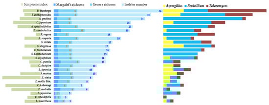There was little variation in herbaceous plant diversity. By contrast, P. thunbergii displayed the highest morphological diversity (Figure 3) and formed a thick canopy. Pinus thunbergii trees thrive for extended periods at the rear of coastal sand dunes and retard dune erosion. The distribution patterns of their endophytes markedly differ from those of herbaceous plants. Talaromyces predominates in P. thunbergii (Figure 3). By contrast, Penicillium was extremely dominant in the herbaceous plants (Figure 3). As Talaromyces predominated, the Simpson’s index was not low (Figure 3).