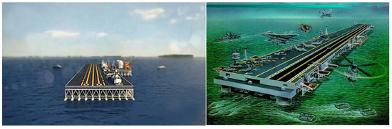 At present, offshore structures tend to increase in dimension and complexity. The so-called large multi-body floating offshore structure shown in Figure 1 and Figure 2 is a new type of floating offshore structure which has appeared in recent years, which is mainly composed of a substructure, connecting structure (truss or column), upper box structure, and superstructure. The substructure is composed of a row of distributed floating bodies. The length and width of the floating offshore structure are very large, while the height is very small. It is an extremely flat and flexible structure. Its stiffness and vibration natural frequency are low, and the elastic deformation cannot be neglected. The calculation of the floating body as a rigid body may greatly underestimate the bending moment [1]. In addition, under the wave action of multiple floating bodies, the reflected wave of a floating body will affect the motions and loads on other floating bodies, and waves will be amplified or sheltered in some areas. The fluid flow around the floating bodies is very complex, especially when the spacing between dispersed floating bodies is small and the fluid resonates inside the spacing. In addition, the viscous effect is also obvious, which makes it particularly difficult to predict the motions and loads of floating bodies. Since the size of a single floating body in the substructure is relatively small, strong nonlinear phenomena, such as wave overtopping the floating body and the water entry and exit of the floating body, will occur under severe sea conditions. Therefore, it is necessary to analyze the deformation of this large-scale offshore structure under fluid loads and the influence of floating body deformation using nonlinear hydroelastic methods accounting for the fluid viscosity, so as to obtain the wave loads and structural responses. According to the results of the tank model test, the deformation and displacement of each floating body are consistent at each time in head seas. Therefore, in order to reasonably reduce the difficulty and complexity and also to focus on the main problems, the present study chose to analyze the hydroelastic behavior of a single body instead of an entire floating structure and verify the feasibility of the CFD-FEA coupling method. The large multi-body floating offshore structure has many usages. The floating offshore structure of a length of 300 m is an independent and complete module, i.e., a module of a 300 m long structure alone can also be used as a floating port; in this case, a single module can be analyzed. If a larger length is required, such as that used as a floating airport, several modules can be connected by connectors. In the case of a large floating structure comprising of several modules, it is still reasonable and appropriate to start with the hydroelastic analysis of a single module.