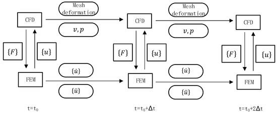 The coupling approach is shown in Figure 3, where is the initial time and is the time step. At the initial time, the finite volume method (FVM)-based code STAR-CCM+ is used to calculate the fluid pressure and shear force on the floating body surface, and then the quantities obtained by the FVM are applied to the floating body surface in the finite element model in ABAQUS by means of data mapping. Under the action of fluid pressure and shear force in the fluid domain, the velocity and acceleration of the finite element nodes of the floating body will vary, which leads to the motions and deformations of the fluid–structure coupling interface. Then, the node displacements are transferred to STAR-CCM+ to update the coupling interface. The pressure field and velocity field obtained by STAR-CCM+ are then transferred to the next time step, as well as the velocity and acceleration of the nodes obtained by ABAQUS.
