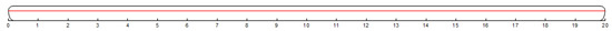 The length of a single floating body of large multi-body floating offshore structure is 300 m, the height is 7.5 m, the width is 5 m, the draft is 5 m, and the mass is evenly distributed along the length of the single floating body. The transverse cross-section of the single floating body is shown in Figure 6, and the thickness of the single floating body plate is 20 mm. The hollow rectangular beam is used as the backbone beam to simulate the stiffness of the whole floating body. The floating body has 21 stations (0–20 stations) in total, and is divided into 20 sections, as shown in Figure 7. The red line in Figure 7 denotes the backbone beam.