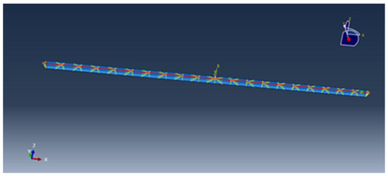 The single floating body of a large multi-body floating offshore structure is shown in Figure 8. The structural model is composed of two parts, the hull surface and the backbone beam, as shown in Figure 9. The hull surface of the floating body is modeled using shell elements, denoted by the blue surface in Figure 9. The hull surface is the fluid–structure coupling interface, where the external fluid loads are mapped from the fluid domain, which makes no contribution to the overall stiffness and mass of the floating body. The backbone beam is simulated by three-dimensional Timoshenko beam elements, denoted by the red line in Figure 9, which contributes to the stiffness, mass, and moment of the inertia of the floating body. The beam elements are connected to the shell elements by kinematic coupling constraints. The CFD solutions for the external fluid loads in the fluid domain are transferred to the FEA model in the structure domain through the hull surface for structural dynamic analysis. Once the structural dynamic analysis is done, the solutions for the motions and deformations of the backbone beam are obtained. Because of the kinematic coupling constraints between the beam elements and the shell elements, the motions and deformations of the backbone beam will also be fed back to the hull surface for the subsequent hydrodynamic analysis in the fluid domain.