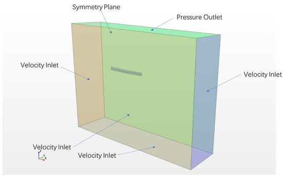 The fluid domain modeling and mesh generation are carried out in STAR-CCM+. The wavelength is set to be L, the length and width of the fluid domain are 4L, the distance between the static water surface and the bottom of the domain is 2L, and the distance between the static water surface and the top is 2L. The boundary conditions are set [8,21] as shown in Figure 10. A pressure outlet is applied at the top boundary. The nonslip wall boundary condition is applied at the floating body surface. Since the floating body is a symmetrical structure, and so is the flow about it in head seas, only half of the flow field needs to be simulated. The symmetry plane boundary condition is applied at the center plane of the structure. Regarding the other four boundary planes, the velocity inlet is applied, where the velocity of the wave is prescribed to avoid the gradient generated from the wall and flow [21]. The volume of fluid (VOF) method is used to track free surfaces at the interface between air and water [22]. The fluid domain is meshed as shown in Figure 11. The extent of the whole computational domain is determined by referring to the recommendations of ITTC [23]. The distance between the bow of the floating body and the inlet boundary is 1.5L, and the distance between the stern of the floating body and the outlet boundary is also 1.5L. The FVM is used to solve the fluid domain, and the fluid pressure and shear force on the surface of the floating body are obtained. The direction of the force due to the pressure is perpendicular to the surface of the floating body, and the direction of the shear force is tangent to the surface of the floating body.