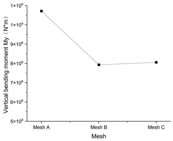 The numerical results for the amplitudes of the vertical bending moment at midship are presented in Figure 13. Mesh B and Mesh C produce similar results, and the average difference between them is 1.6%. In comparison, there is a relatively large average difference, 35%, between the results obtained with Mesh A and Mesh B.