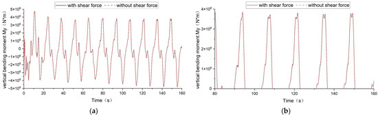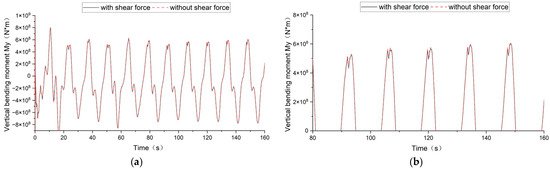 Because the fluid is assumed to be inviscid in potential flow theory, the shear force acting on the wetted surface of the floating body is neglected in SESAM/WADAM [26] and COMPASS-WALCS-NE [27]. As described in Section 2.5, the CFD-FEA method can account for the contribution of the shear force to the global solutions. In order to study the influence of shear force on the vertical bending moment of the cross-section, the numerical results obtained with and without shear force by the CFD-FEA method are compared, as shown in Figure 14 and Figure 15. From the comparison, it can be seen that the influence of shear force on the vertical bending moment of the cross-section is very small.